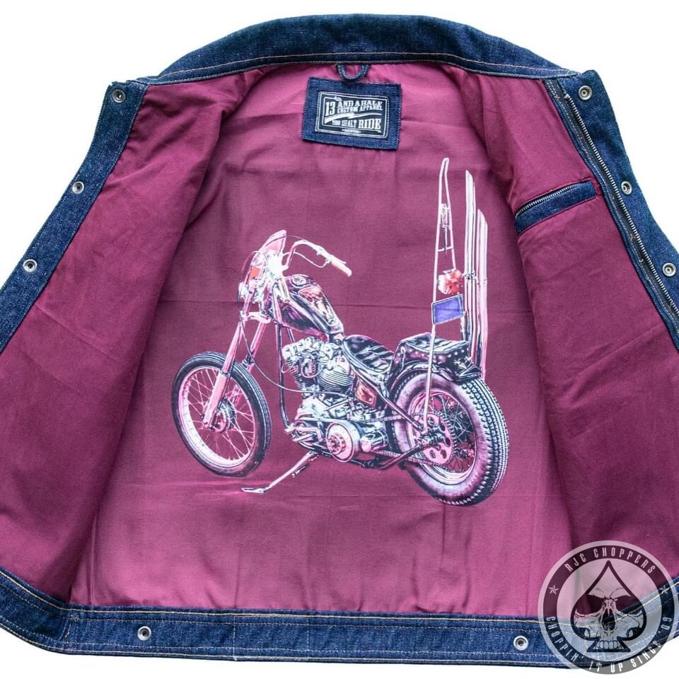 Luuk’s amazing Chopper is not only a sight for sore eyes, it’s also printed on the lining of our 13 1/2 denim vest! Hence the name ‘ Rain-Splitter denim vest’