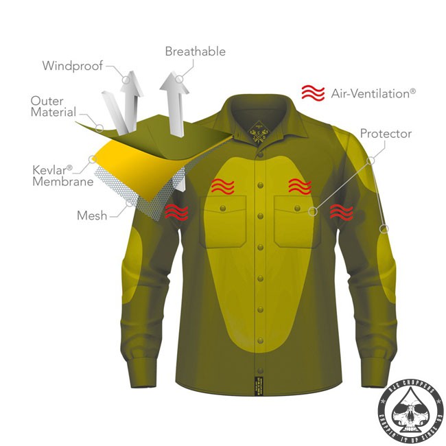 Shirts have a Kevlar lining, integrated air ventilation system and pockets for shoulder, elbow and back protection