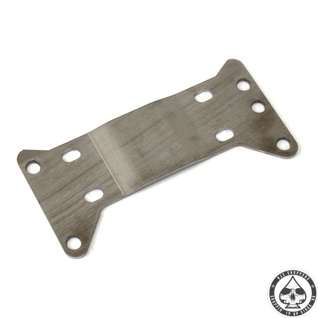 Stock replacement transmission mounting plate for 5-speed transmissions as used on 84-99 softail models but with a 3/4″ offset for mounting a wider rear wheel.