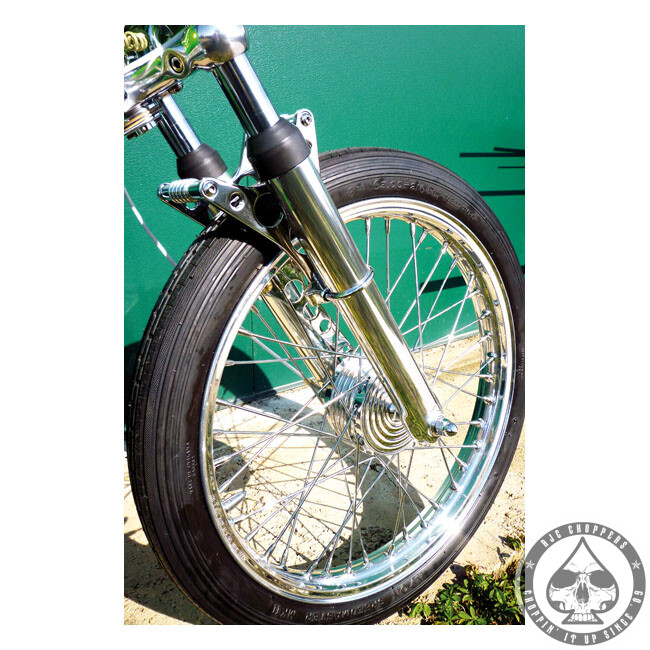 Features 3/4″ bearings, stainless steel spokes and nipples, Akront/Morad rim with chrome mini drum brake.